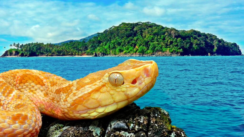 The snakes that live here are golden lanceheads. They are golden, and their heads are lance-shaped, hence their name. Although lanceheads are common in mainland Brazil, the golden lanceheads on Snake Island are about five times more venomous.