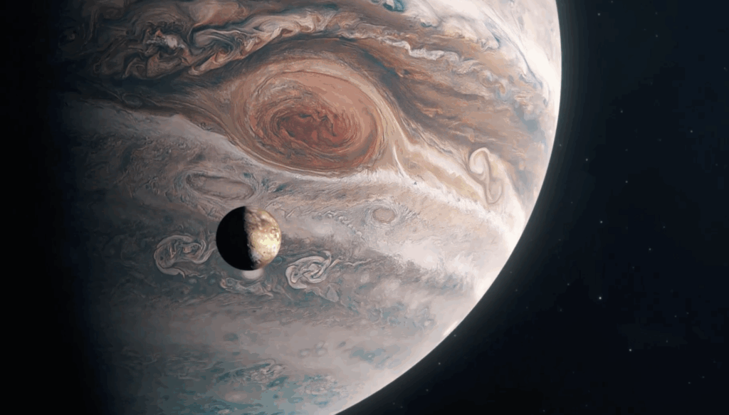 Now that we’ve joined Jupiter’s 79 other moons, let’s scope out our new neighborhood. Jupiter is the largest planet in our Solar System. It’s so big that it could hold over 1,300 Earths inside it. For perspective, think of Earth as a grape. Compared to us, Jupiter would be the size of a basketball.
