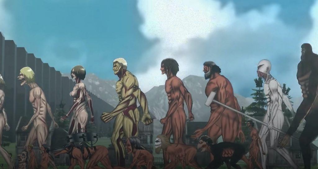 The citizens of this protected city lived in peace for a whole century. Then one fateful day, a colossal Titan breached the wall. That opened a pathway for all sorts of creepy, smaller Titans. These man-eating giants range in size and shape, from 4 to 17 m (13 to 56 ft). But the colossal Titan is much taller at a towering 60 m (197 ft). And they all seem to be nudists, for whatever reason.