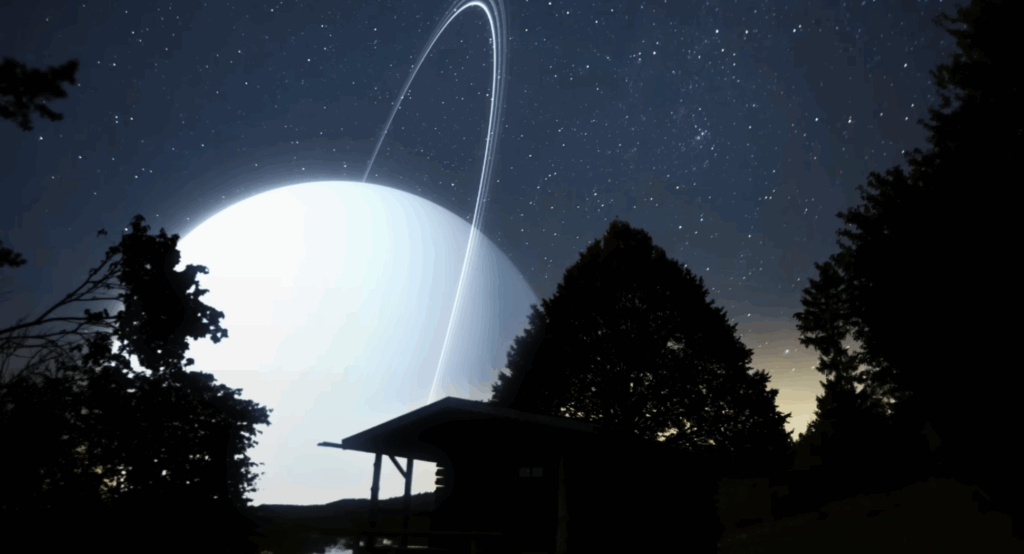 By the time the first asteroids appeared as shooting stars, Uranus would look about the same size as the Moon. But it would be growing rapidly as it moved ever closer. While you’d be here, awaiting humanity’s doom, Uranus would start shaking things up.