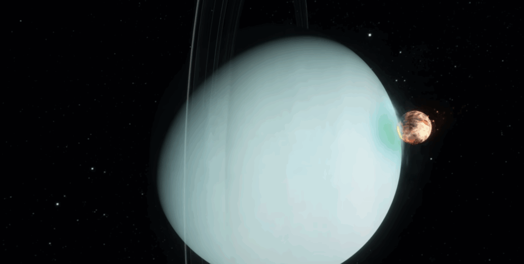 Uranus wouldn’t get away with this assault so easily, however. Last time it collided with another planetary object, twice the size of Earth, it tipped over. Yep, Uranus is the only planet in our neighborhood that spins on its side. This impact featuring our earthly home could help tilt it back to how it once was.